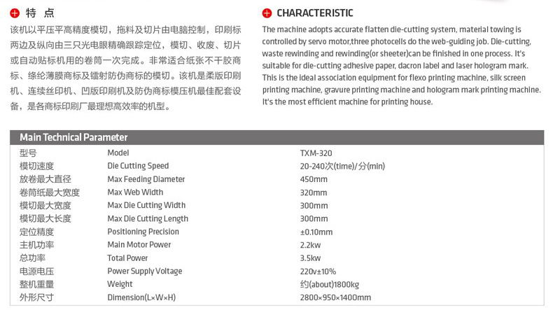 該機以平壓平精度模切,拖料及切片由電腦控制,印刷標(biāo)兩邊及縱向由三只光電眼睛精確跟蹤定位,模切、收廢、切片或自動貼標(biāo)機用的卷筒一次完成。非常適合紙張不干膠商標(biāo)、滌綸薄膜商標(biāo)及鐳射防偽商標(biāo)的模切。該機是柔版印刷機、連續(xù)絲印機、凹版印刷機及防偽商標(biāo)模壓機最佳配套設(shè)備,是各商標(biāo)印刷廠最理想高效率的機型。